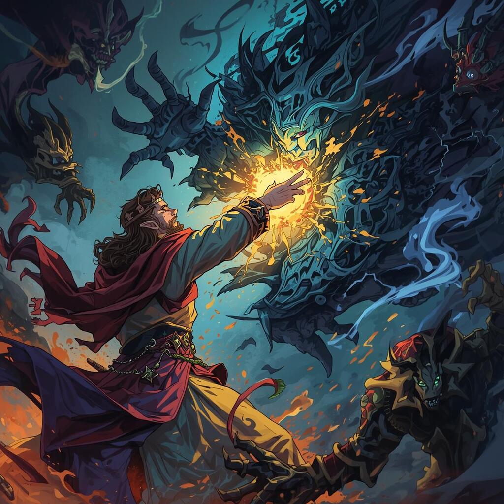 A cleric of Ostandd, God of Order works divine magic against a chaos shadow.