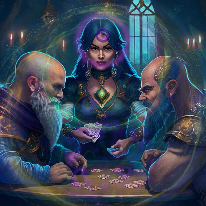 A human psion, Del Zdanin deals cards for two Duarden at the Fat Griffon Casino in Exquistia.