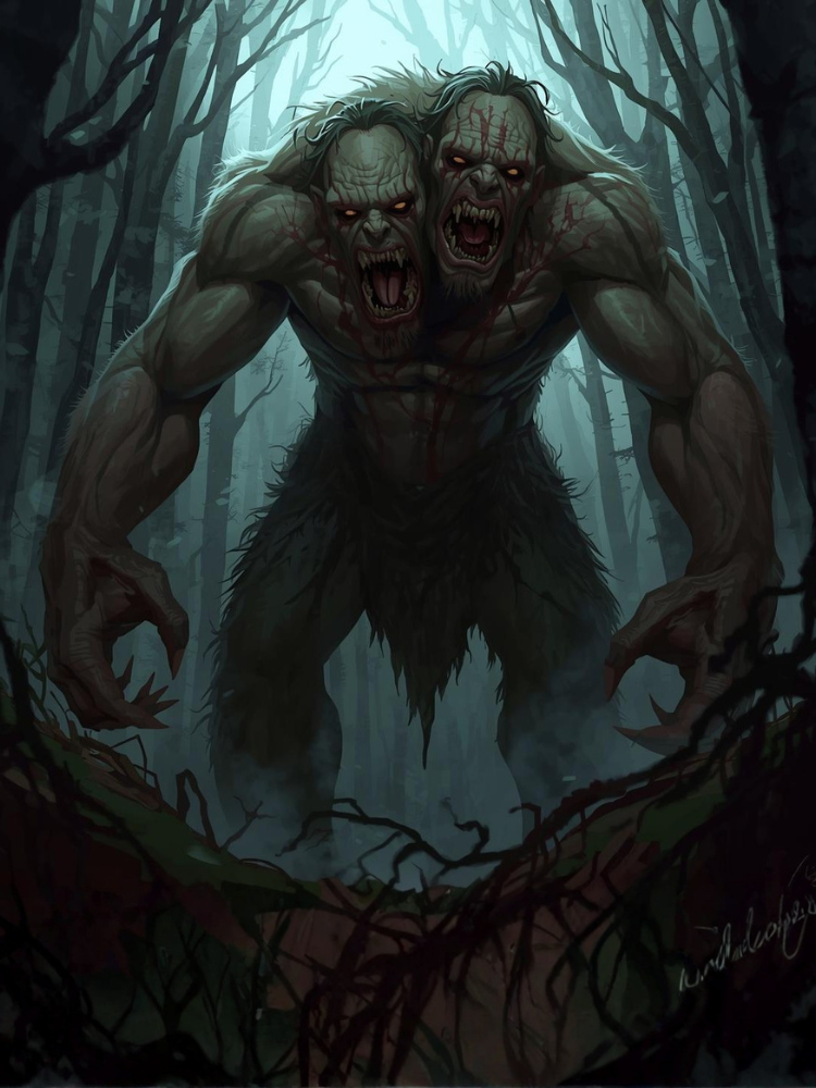 The ettin, or Duarok in their own language, are a smaller species of giant typically reaching 11 to 15 ft in height. They live in large tribal groups in remote regions but some do trade and interact with other races. Their level of civilization varies per tribe, from stone age barbarians to agrarian villages and some groups have metallurgy and artisans.