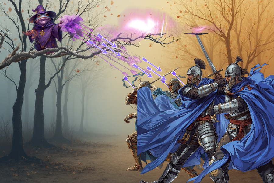 Pidwermin sends magic missiles into the Gutherian soldiers in Bertrand's orchard.