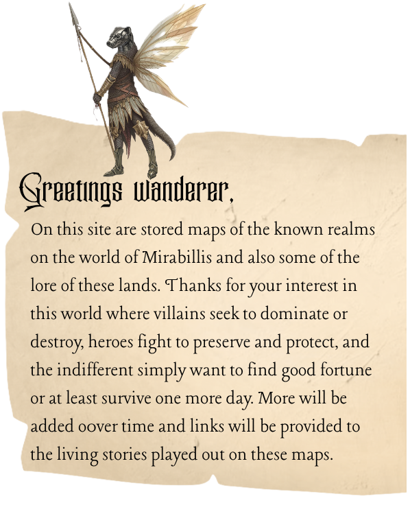 For those who understand such things, Mirabillis is the name of the great orb, or planet on which the vast oceans and varied lands of the realms - known and unknown - were placed by the gods of creation long before the ages of the Habens, Duarden, or Ghorsht.